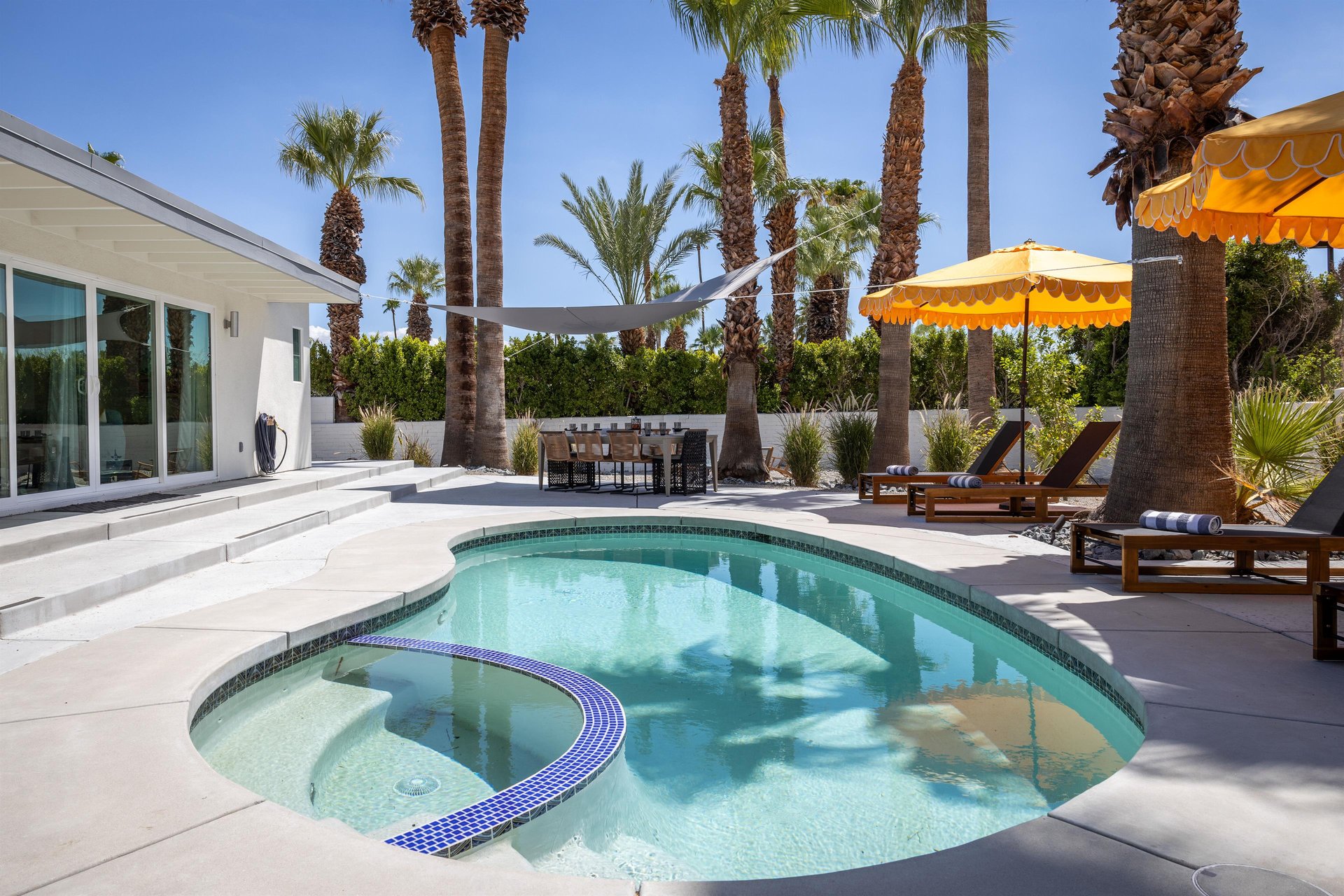 So much personality in the classic mid-century home! Bright and cheerful furnishings and colorful artwork might draw you in, but the action will definitely be outdoors, lounging by the fire pit, private pool, and spa. But you’ve got options! Gather around the fireplace inside and cozy up on the couch for a movie marathon. Your pup is welcome too!